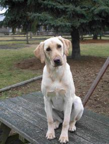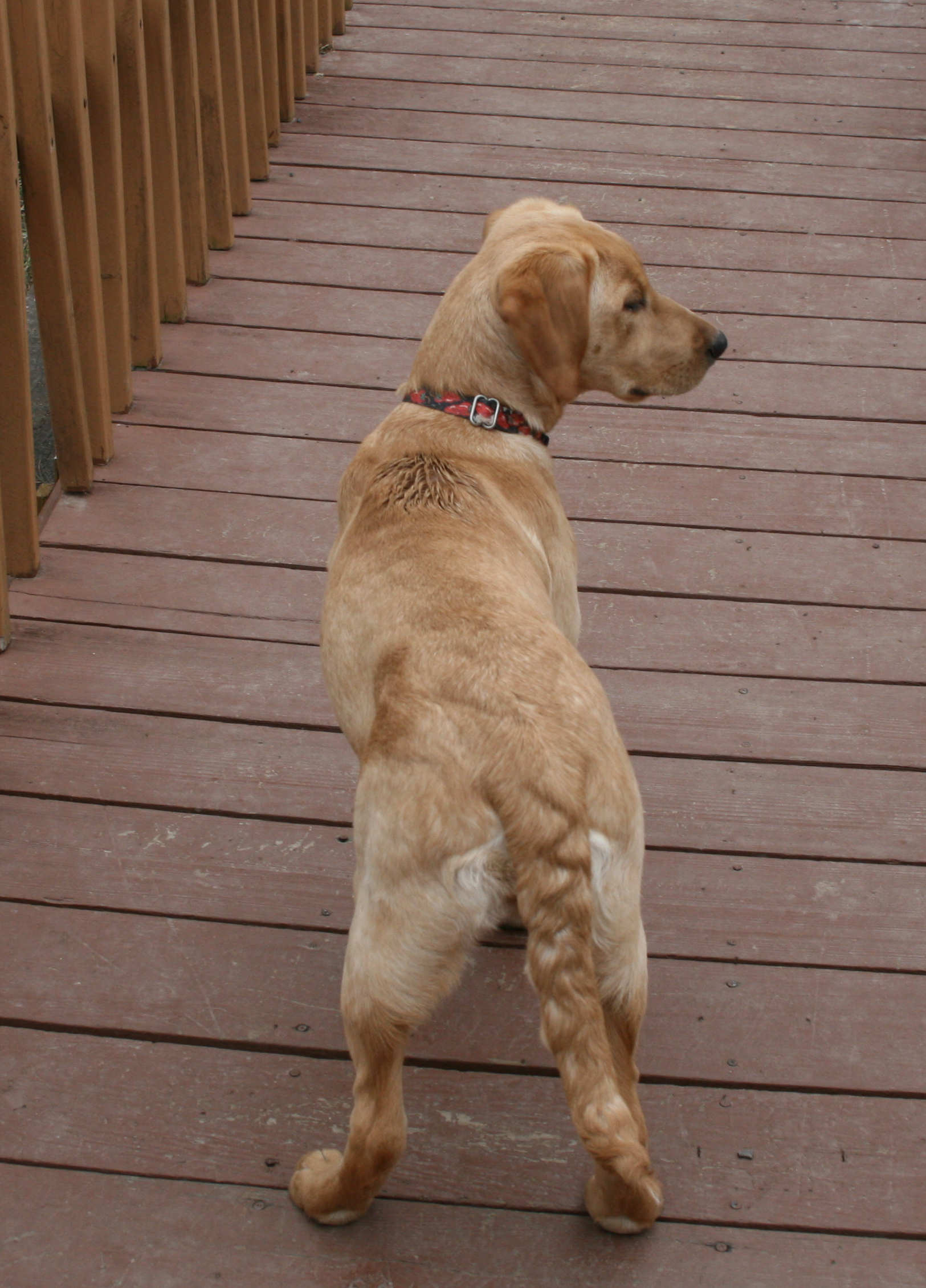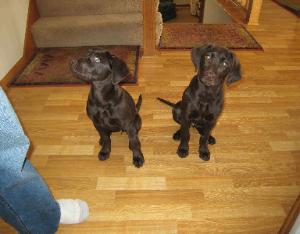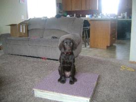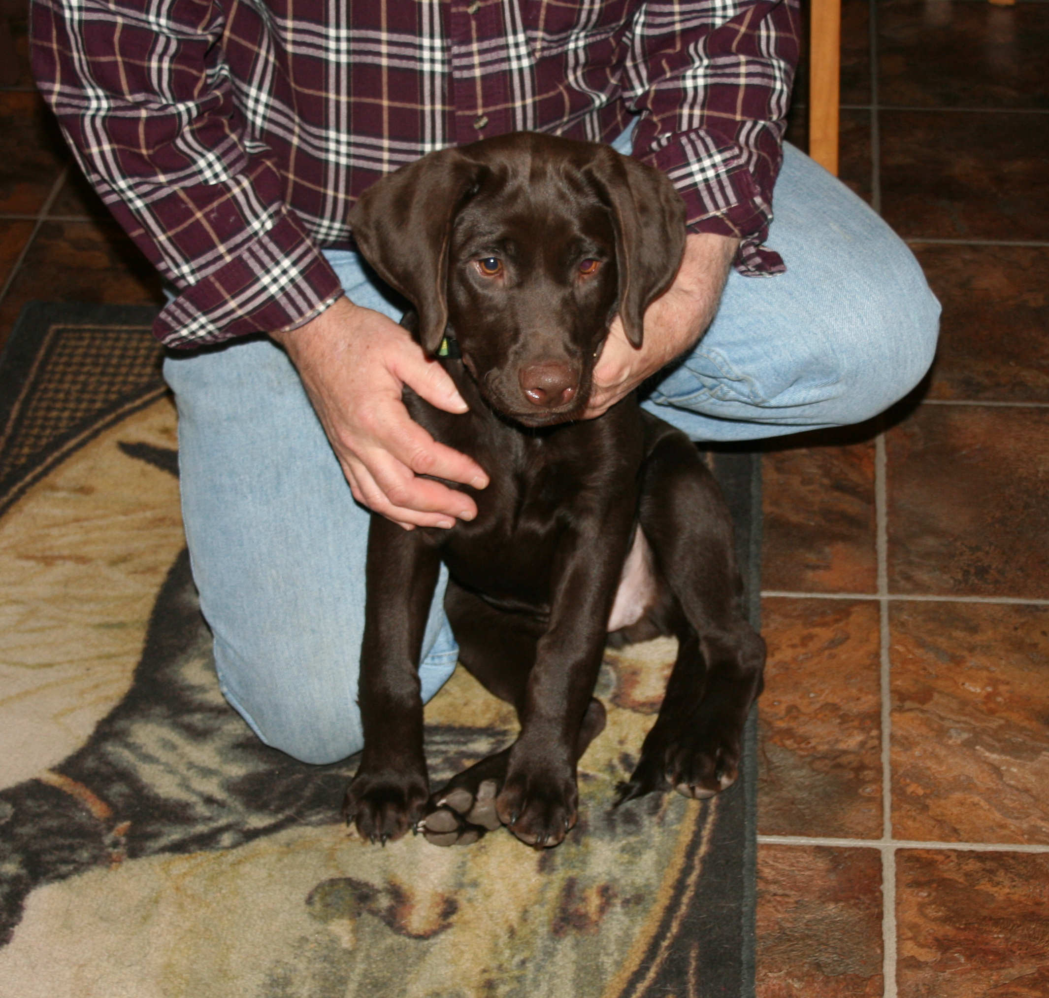 | also had Radar, who was Lexie's full brother from her parents very first litter years ago. 3-12-10 Hey Kim, Just wanted to give you an update on how Beneli is doing. At 14weeks she is potty trained, knows the down, stay, heel, fetch em up, place(for platform training) commands. She is doing very well! She just had her second shots last Wednesday and she is 24.6 pounds. She is very tall and she is starting to lose her puppy fur. I just received her certified pedigree today! Her papered name is:RAINMAKERS FETCHING FANATIC "BENELI" We call her Neli for short! We started platform training on Monday and I cant believe how well she is doing so far. I actually can use hand signals for the left and right place consistantly. Cant wait until it gets a little dryer outside so I can place the platforms farther apart because I think she is ready for that next step! As her name implys, she is a fetching fanatic! Just like Radar was! We go walking in the woods everyday to get her curiosity fix. Well thatnks again for the great PUP!! I will send more pics along the way! Thanks again, Mike |