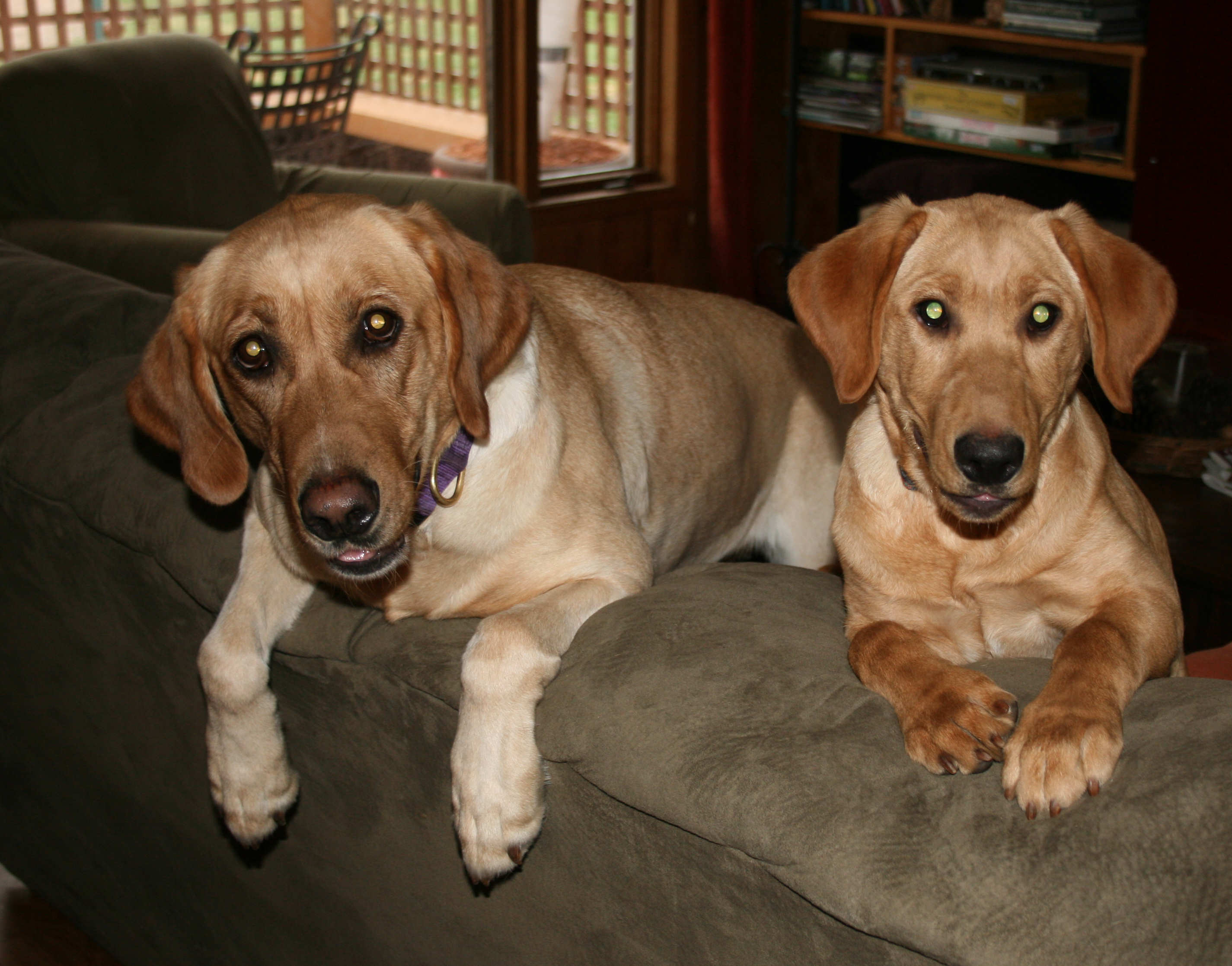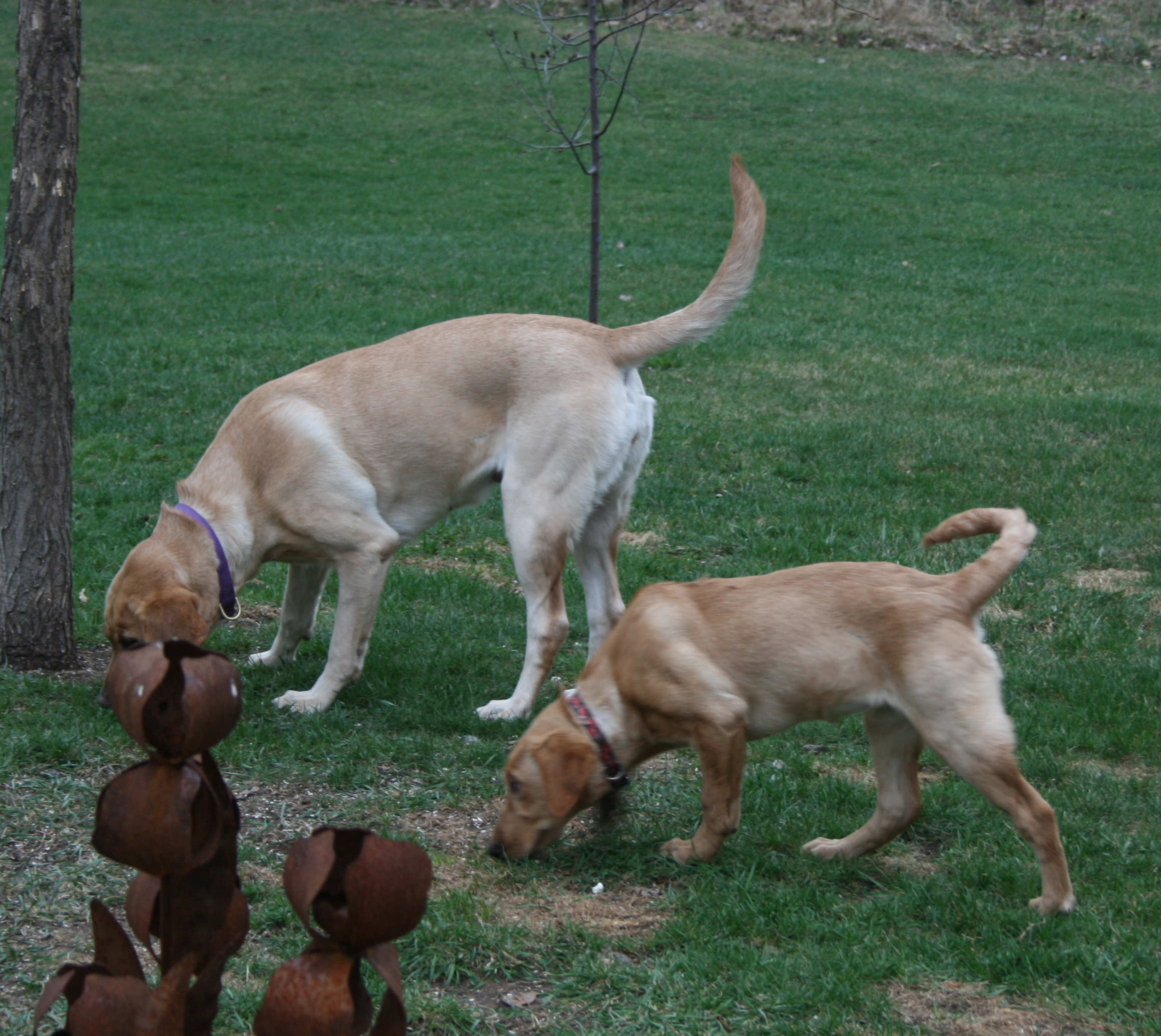 | Also from the Lexie x Riley litter on 3-7-10: Hi Kim, The pups are doing good, potty training and adjusting are going well also. My son's pup comes over to our house Monday-Friday during the day (day care) and they are full of energy! They both love going for walks now that it is nice out. At their 9 week visit to the vet, Macy was 15 lbs and Maggie was 15.8 lbs. They go again next week and now they are looking like they have grown quite a bit again. The attached pictures are Macy(dark pink) on the left and Maggie (yellow) on the right. Thanks for great pups. John, Jeannie, and Eric B. |